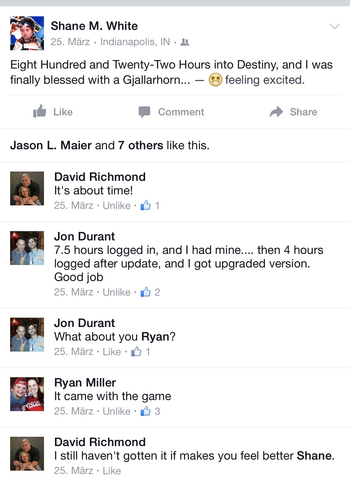 For years before Destiny, my gamertag was Weisser Junge - literally White Boy in German. This name got butchered all the time by Americans playing Halo. I didn't want the same thing to happen in Destiny, so the week before the game launched, I changed my name to Jedi Browncoat (my original Gamertag for years was Jedi Whiteboy, yeah super-nerd status). I loved the name, and I actually got a lot of messages from other Destiny players telling me that they too liked my name. During LFG raids, it was often talked about. So, I was happy. Until that "No Spaces and Divisible By Three" Law came to my attention. So, in Mid-March I spent days attempting to come up with a new moniker to use as my gamertag. Eventually settling on MegaShanetastic. "Shanetastic" had been a nickname given to my by friend Heather, and this was at the height of megaman.exe and his Xur revelations on the Destiny Reddit. So, when Shanetastic only added up to eleven letter, adding the "mega" gave me what I needed to make name that fit into the limitations I believed I needed. This all sounds crazy, I know. What was even more crazy was two weeks later, when it worked. Crota. Hard Mode. Ir Yut, the Deathsinger. Gjallarhorn. I was speechless. I was quiet. I jumped off the couch - where Caitlin was sitting next to me - and shook my fist into the sky out of sheer joy. Inside my head was screaming and yelling at the top of my lungs - but in the game, I played it cool as I could, while everyone else reacted to it. I immediately texted Steve a screenshot - as he was not in the raid that night. It was a rather interesting night.